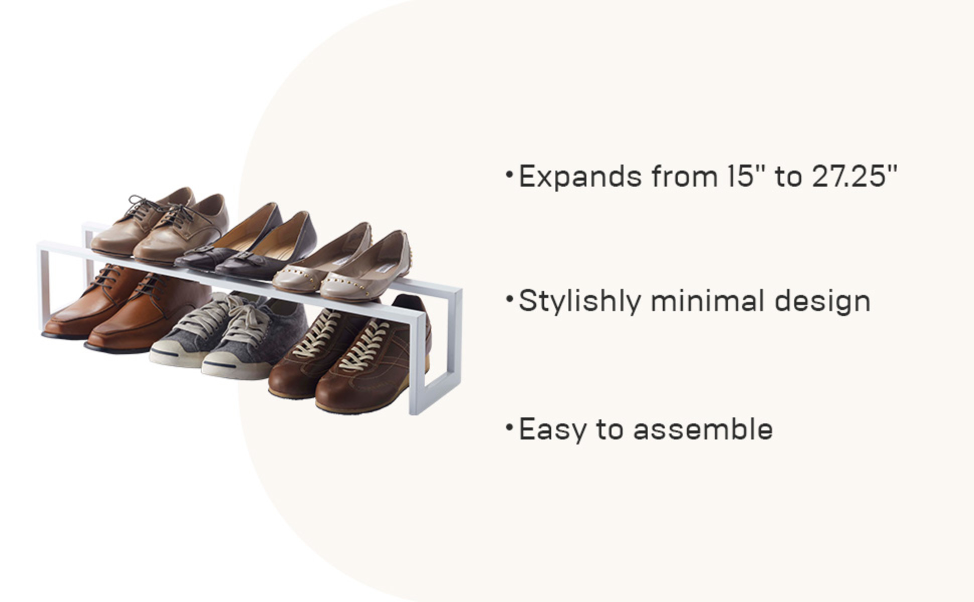 [Expandable shoe rack for entryways and closets] With a minimal design and expandable feature, this shoe rack is a great adjustable option for any entryway or closet, from large to small. A light frame makes it easy to move as needed.