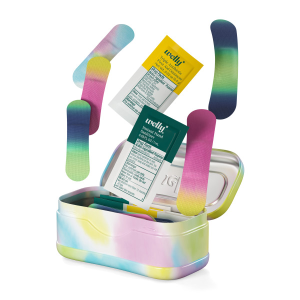 Our 24ct Colorwash First Aid Kit keeps you prepared in style. This handy portable tin is packed with first aid essentials like ointments and hand sanitizers along with colorful bandages for every adventure ahead. Keep one on hand for wherever life takes you.Welly is for everyone that was afraid to fall down, fail, get bumped, get scratched and did it anyway. Welly is for the wellness in all of us, however that looks, and for being prepared for whatever comes our way. We wear our bandages like badges of honor for a life fully lived. Our portable first aid kits are packed with essentials, so you have what you need, when you need it. And our signature Welly tins can be reused again and again—the possibilities are endless.