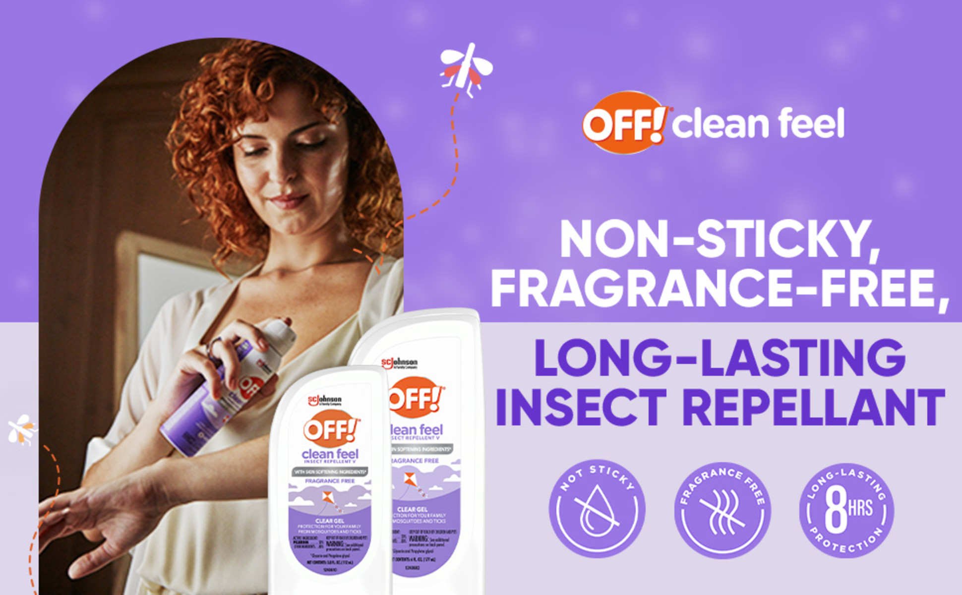 Use OFF! Clean Feel bug sprays and insect-repellent gel for long-lasting protection that’s light on skin with no oily or greasy residue.