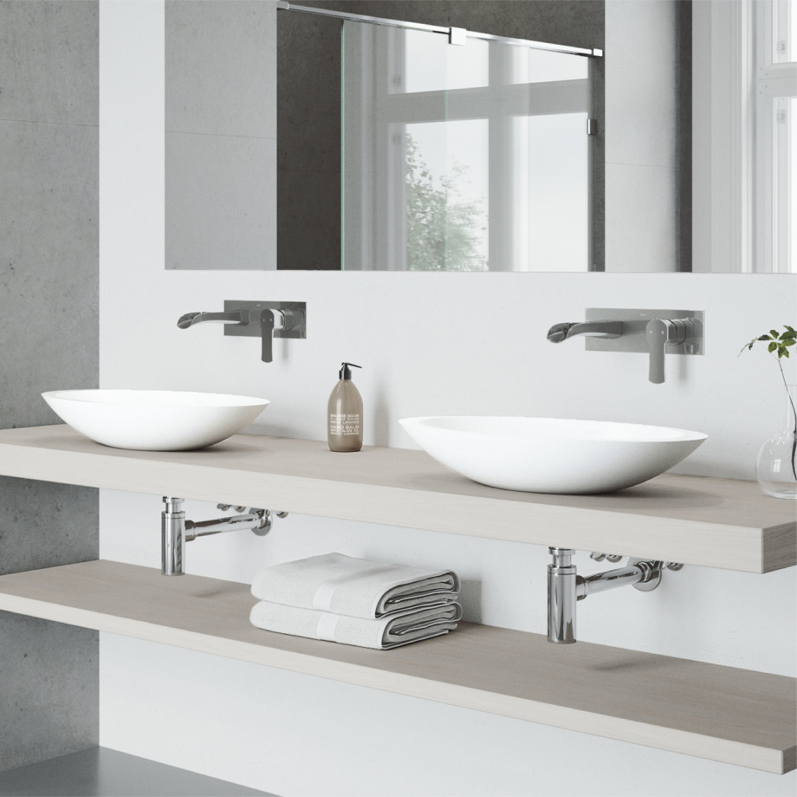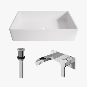 Effortlessly elevate any bath design when you pair a sleek wall mount faucet with a vessel sink and matching drain from VIGO.