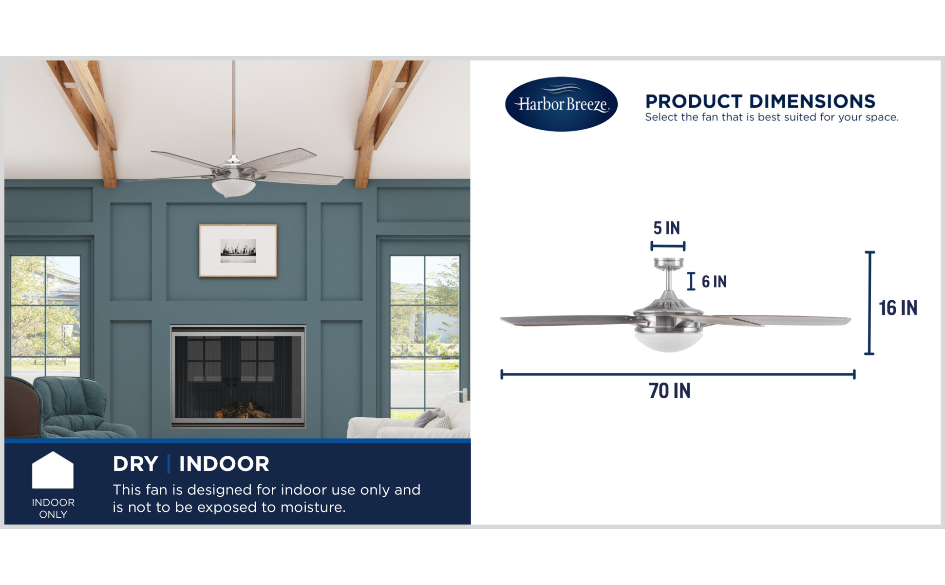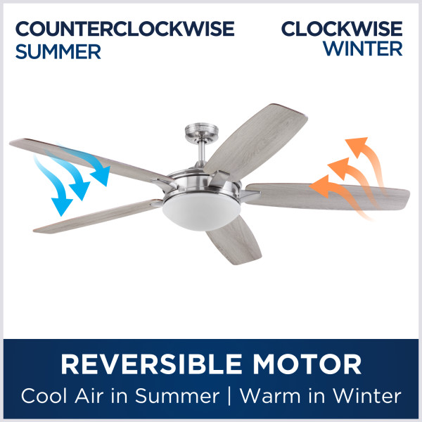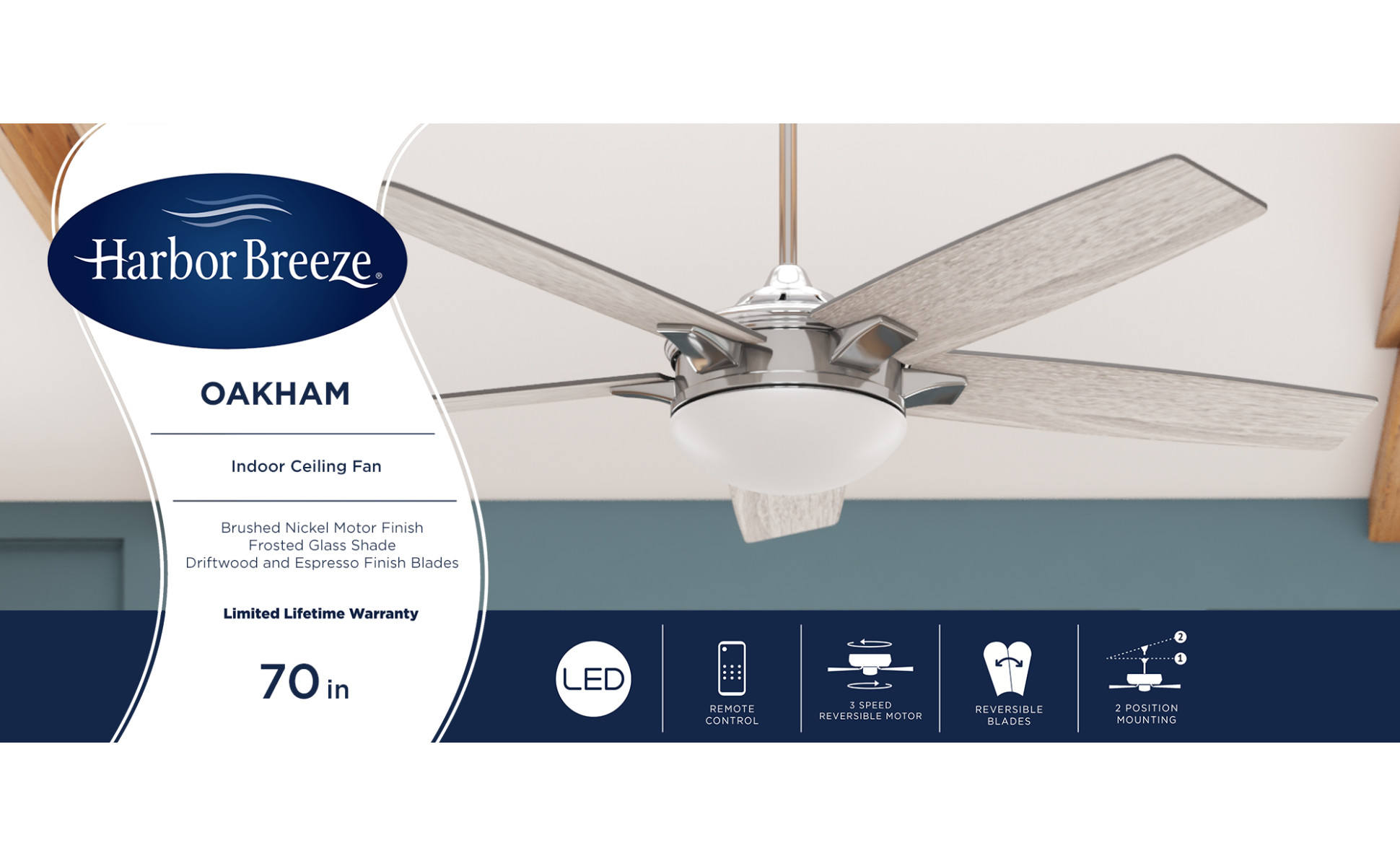 Brushed nickel finish ceiling fan from the Oakham collection features 5 reversible driftwood/espresso blades so you can choose the right look for your home