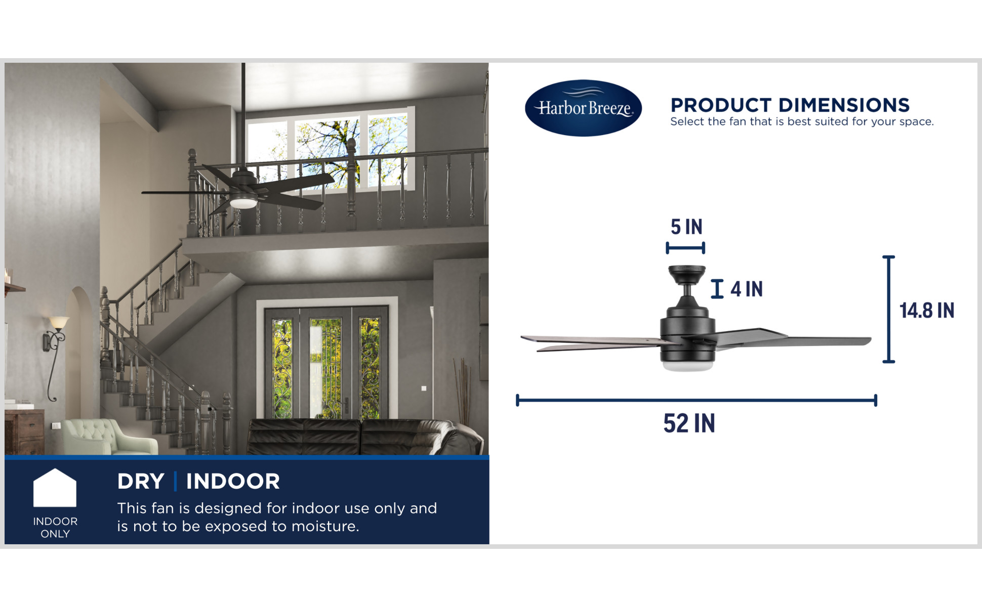 This fan can be hung indoors from standard or angled ceilings using the 4-in downrod that’s included