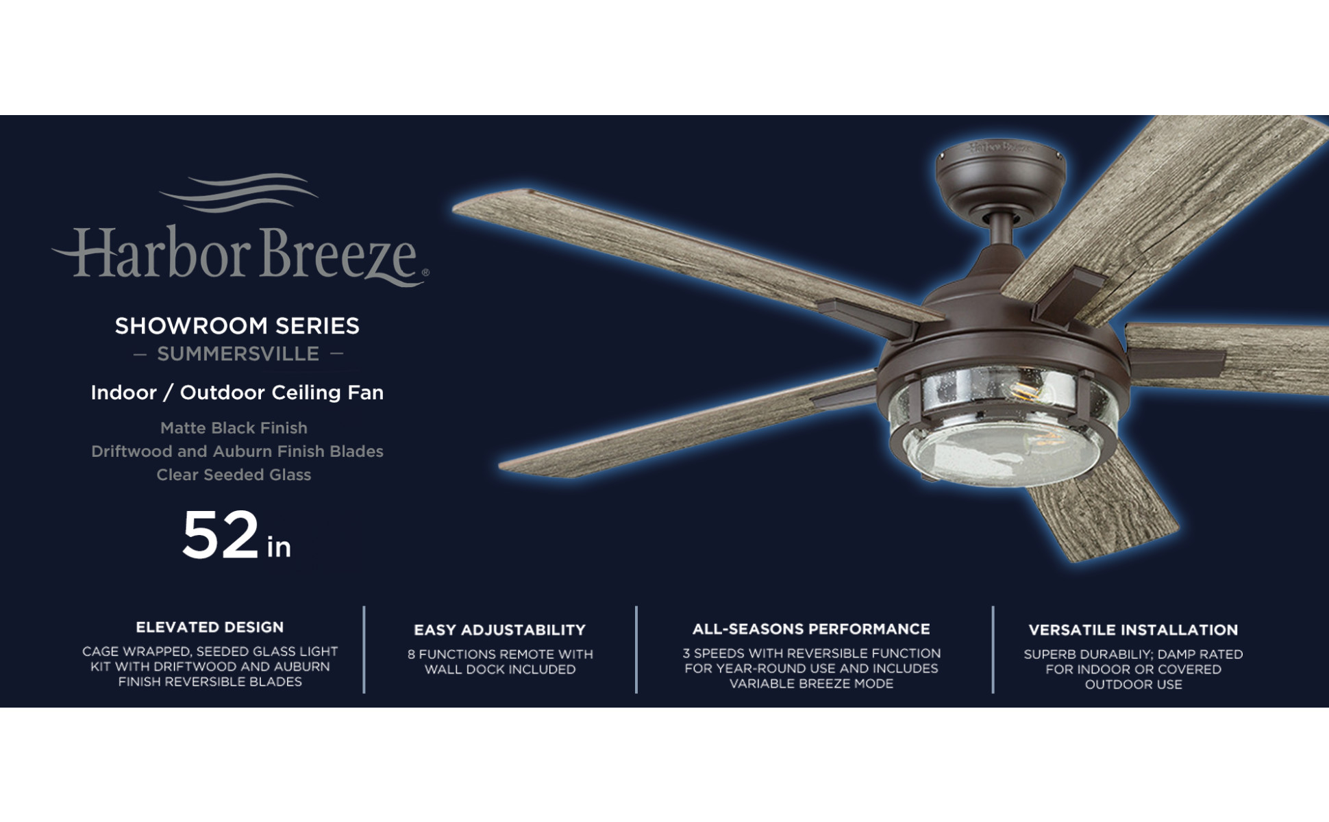 Bronze finish from the Summersville collection features 5 reversible driftwood/auburn fan blades, making it easy to choose the look that's just right for your space