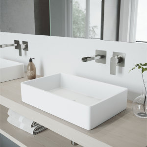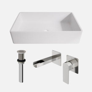 Effortlessly elevate any bath design when you pair a sleek wall mount faucet with a vessel sink and matching drain from VIGO.