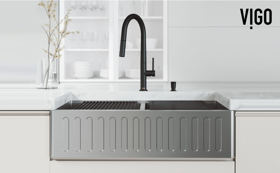 Multitasking efficiency is made stylish with the VIGO Oxford Kitchen Workstation and Greenwich Pull-Down Faucet Set. The sink is a handcrafted 36-inch double bowl , slotted Aprondurable stainless steel, 16-gauge model. It is undercoated with SoundAbsorbTM technology to minimize noise from cookware and prevent condensation. The Oxford sink has an inner ledge on which a sleek black cutting board and roll-up silicone drying rack easily rest. Use them in the sink or slide them out and place on the countertop for additional space. Paired with the sink is the stylish pull-down sprayer Greenwich Faucet. Well-built from solid brass construction, this faucet is easily identified by its tall arch and gooseneck design. A matching in-counter soap dispenser sits beside the faucet and holds up to 10 ounces of hand soap, hand lotion, or dish soap. To complete this set are two protective stainless steel bottom grids and fitted stainless steel strainers. Classic, contemporary, and versatile, this set is made with you in mind.