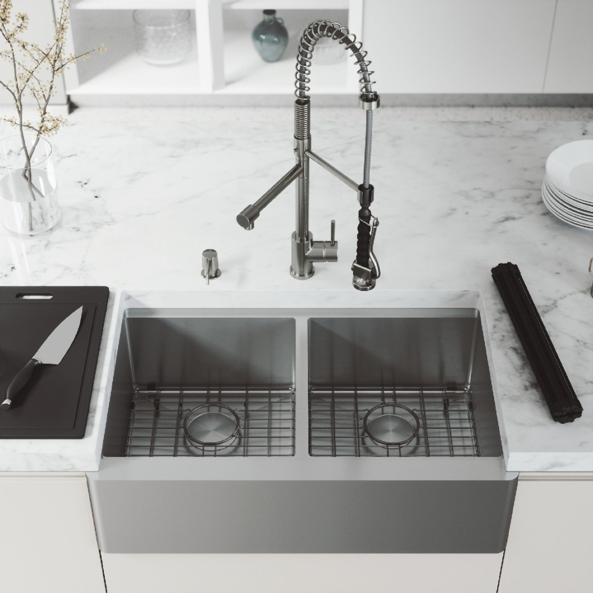 Multitasking efficiency is made stylish with the VIGO Oxford Kitchen Workstation and Edison Pull-Down Faucet Set. The sink is a handcrafted 33-inch double bowl , flat Aprondurable stainless steel, 16-gauge model. It is undercoated with SoundAbsorbTM technology to minimize noise from cookware and prevent condensation. The Oxford sink has an inner ledge on which a sleek black cutting board and roll-up silicone drying rack easily rest. Use them in the sink or slide them out and place on the countertop for additional space. Paired with the sink is the bestselling pull-down sprayer Edison Faucet. Strong and outfitted with a coiled design to hold the extendable faucet into place, this faucet is the epitome of high-end style with premium-made components. A matching in-counter soap dispenser sits beside the faucet and holds up to 10 ounces of hand soap, hand lotion, or dish soap. To complete this set are two protective stainless steel bottom grids and fitted stainless steel strainers. Classic, contemporary, and versatile, this set is made with you in mind.