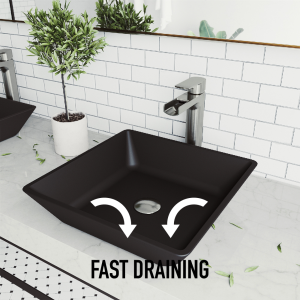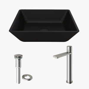 From deliberate design and pristine construction comes the VIGO Black Roma MatteShell Vessel Bathroom Sink. Innovative and intense, MatteShell sinks bring the same excellence of classic solid tempered glass sinks and take them to the next level. The Black Roma is deeply opaque and has an eggshell-like sheen that is rich yet subtle. Its deep ebony shade is infused into the sink itself, eliminating any risk of a chipped finish. The sink also has a fingerprint-free coating to prevent the appearance of marks. The sink has a distinctive rectangular shape with curved edges. This design makes it easy to maintain and love in the home as a unique piece of functional art. Experience the synergy of character and style all in one with the VIGO Roma MatteShell.