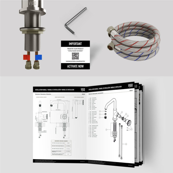Enjoy a hassle-free setup with the complete package, which includes the fully assembled faucet, cold/hot PEX metal braided supply lines, an Allen key, installation instructions, and a warranty registration card.