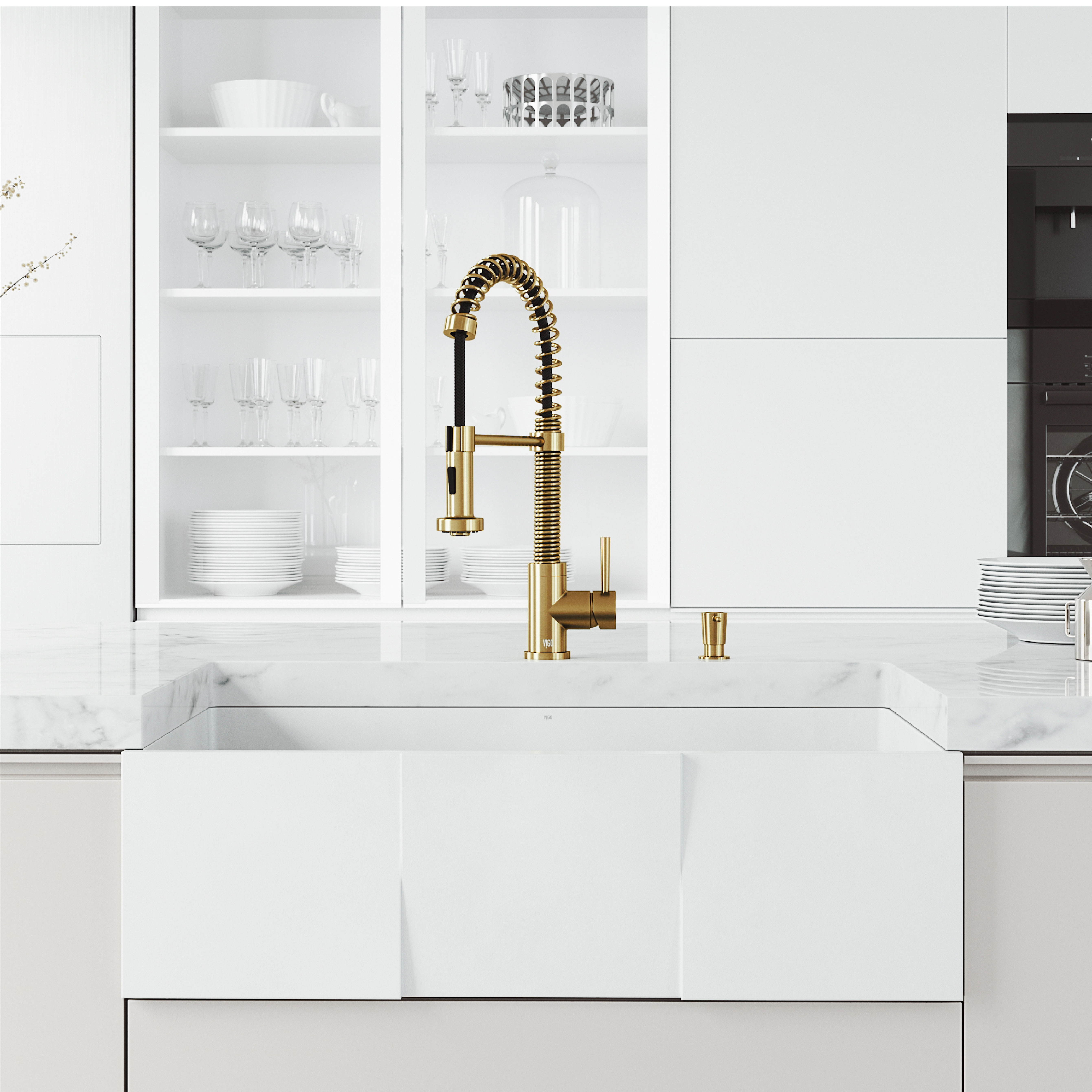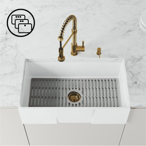 Elevate your design with kitchen sink accessories including a matching sink drain, soap dispenser, or deck plate available from VIGO. Gooseneck kitchen faucets pair beautifully with a variety of VIGO kitchen sinks.