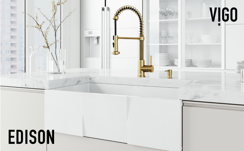 VIGO presents the Edison pull-down kitchen faucet with a soap dispenser. The Edison features a 360° swivel spout with a retractable hose that extends up to 30 inches for your convenience. The sleek high arc coil protects the pull-down hose from accidental damage, while its solid brass body lasts a lifetime. The spout delivers impressive performance at a 1.8 GPM flow rate, and the single handle allows easy control over the water and temperature. VIGO's premium hardware finish makes the faucet effortless to clean. Make the Edison pull-down faucet an essential part of your kitchen upgrade.