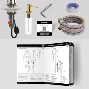 Receive the pull-down spray kitchen faucet with connected hardware and pipes, cold/hot PEX metal braided lines, an allen key, plumbing tape, installation manual, and warranty card.
