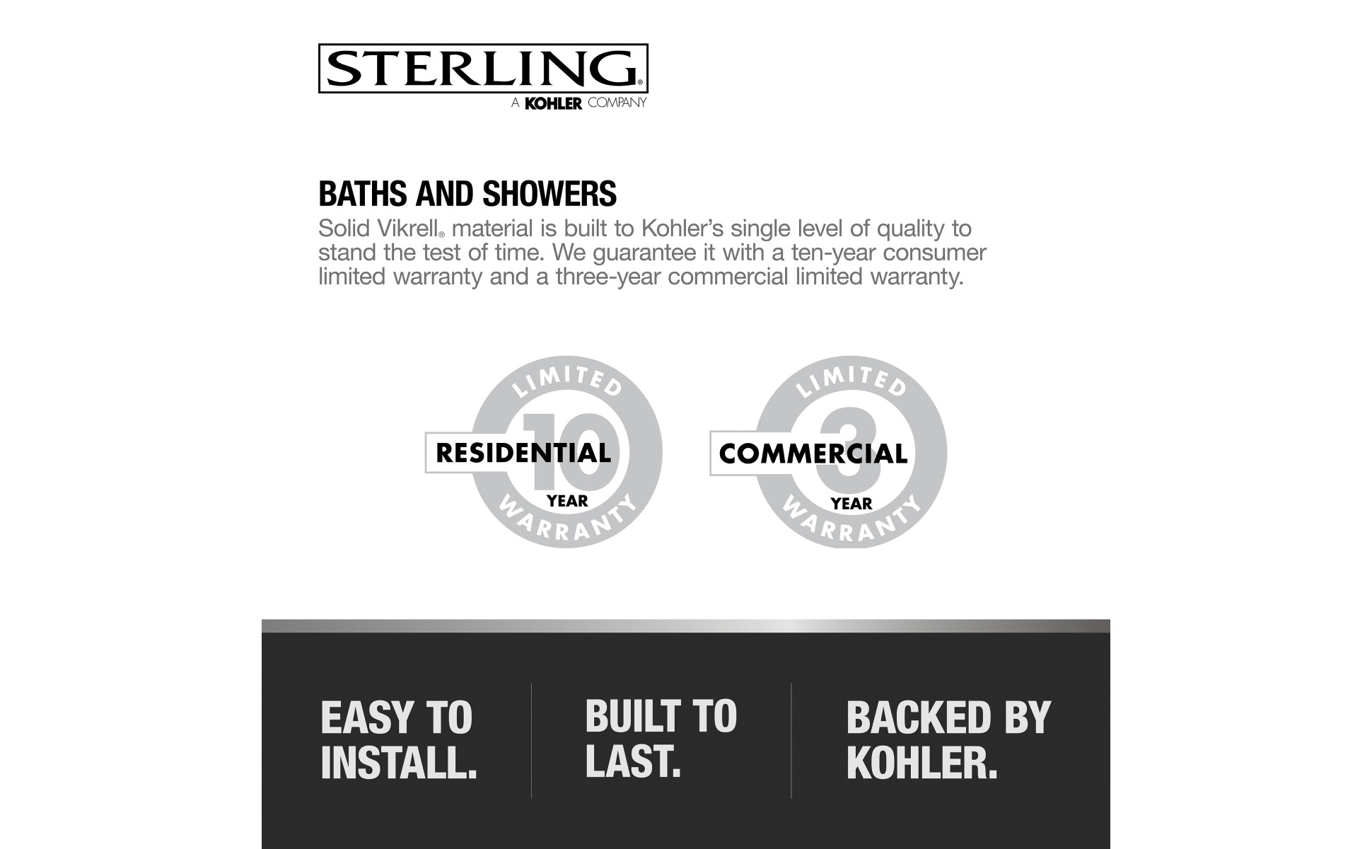 If you’re a professional working in the trades, STERLING® has your back, which is why we design all of our products with you in mind. We provide a range of no-nonsense designs at a price to fit every budget. Our kitchen and bath faucets come pre-assembled in the box. All our baths and showers are manufactured from Vikrell® which is exclusive to STERLING and is made from one solid piece of sheet-molded compound that’s easy to haul through a job site. Vikrell baths and showers snap into place for a water-tight seal—no caulk required. STERLING. Easy to install. Built to last. Backed by KOHLER.