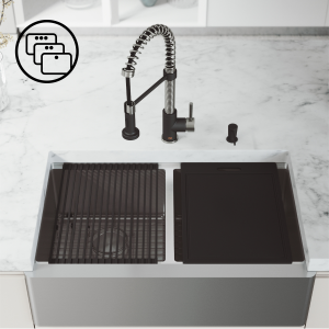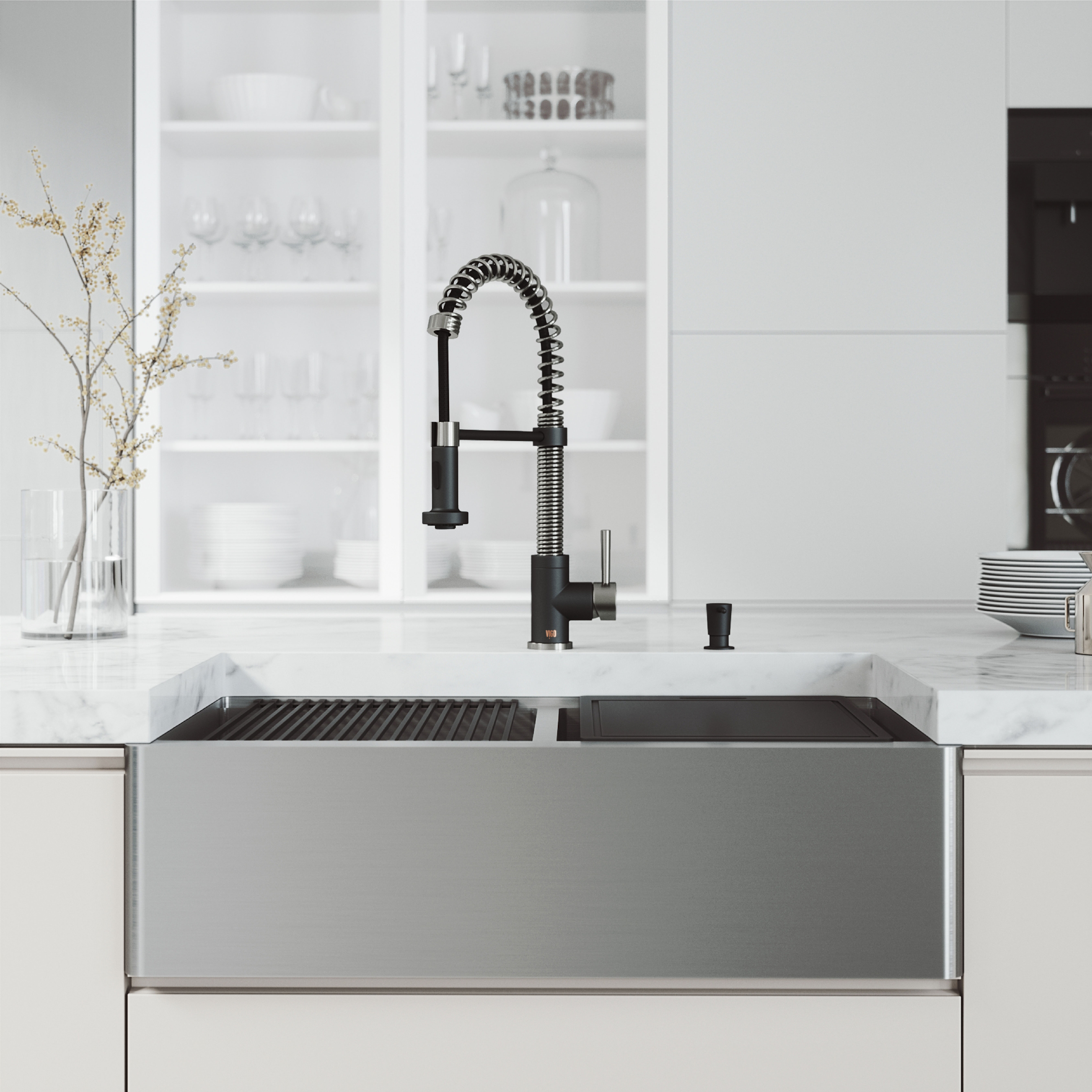 Elevate your design with kitchen sink accessories including a matching sink drain, soap dispenser, or deck plate available from VIGO. Gooseneck kitchen faucets pair beautifully with a variety of VIGO kitchen sinks.
