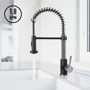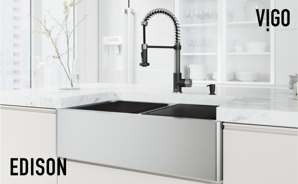 VIGO presents the Edison pull-down kitchen faucet. The Edison features a 360° swivel spout with a retractable hose that extends up to 30 inches for your convenience. The sleek high arc coil protects the pull-down hose from accidental damage, while its solid brass body with stainless steel and matte black finish lasts a lifetime. The spout delivers impressive performance at a 1.8 GPM flow rate, and the single handle allows easy control over the water and temperature. VIGO's premium hardware finish resists fingerprints, making the faucet effortless to clean. Make the Edison pull-down faucet an essential part of your kitchen upgrade.