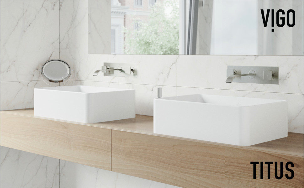 The geometry-focused Titus by VIGO is an elegant wall-mounted faucet that explores clean lines and precision. Mounted on the wall above a vessel sink, The Titus offers two square-shaped handles and an elegantly curved spout that delivers the water in a flat thin ribbon. The relaxing stream of water works in conjunction with the silhouette of the faucet to create an exquisite wash routine. This wall-mounted bathroom faucet provides more counter space and a cleaner look for any bathroom vanity.