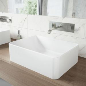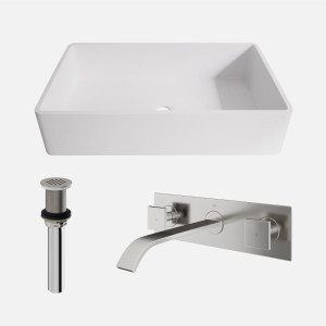 Effortlessly elevate any bath design when you pair a sleek wall mount faucet with a vessel sink and matching drain from VIGO.