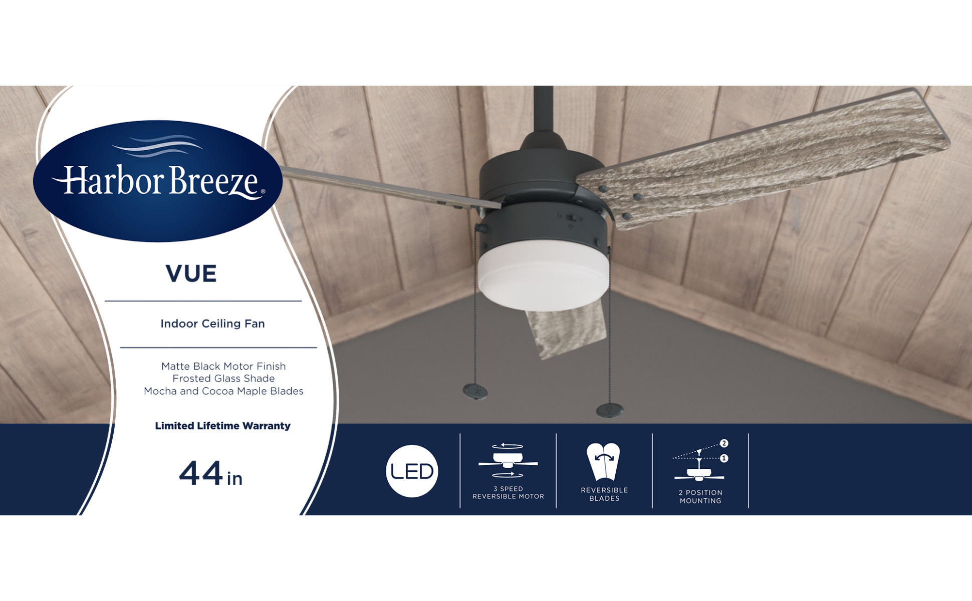 Matte black finish from the Vue collection features 3 reversible mocha/cocoa blades so you can choose the look that is just right for your home