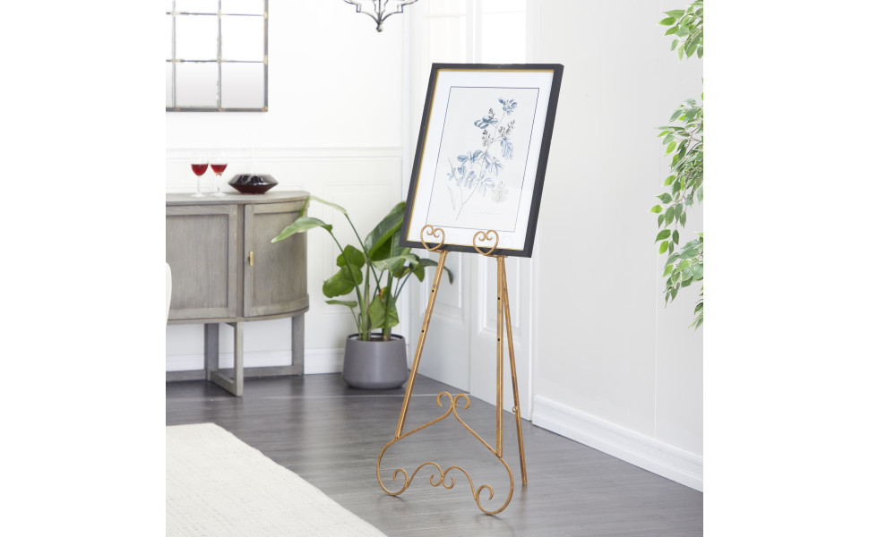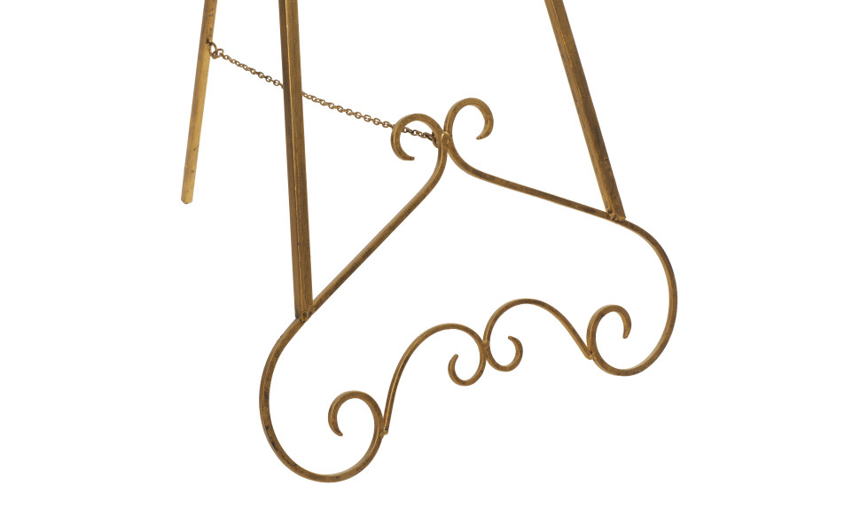 Stylish and artistic easel features a solid iron construction in a luxurious gold finish furnished with a scrolling iron base welded into a tripod leg system for a stable displaying experience