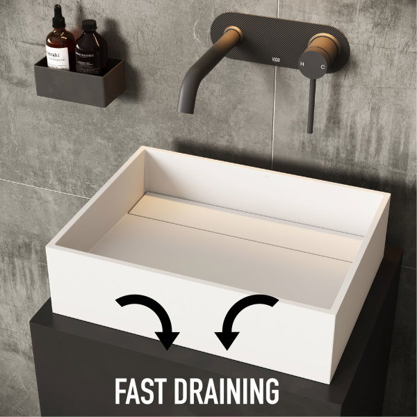 The sink's shape and grooves facilitate rapid water drainage, preventing overflow and promoting a cleaner, more hygienic environment by swiftly eliminating any residue or water stains from the surface.