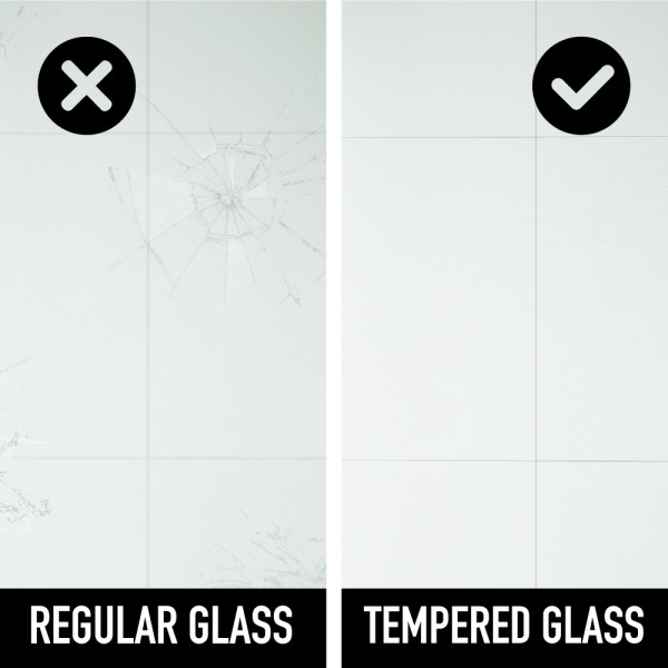 The tempered glass used is 3/8" thick and ANSI Z97.1 and 16 CFR 1201-certified.