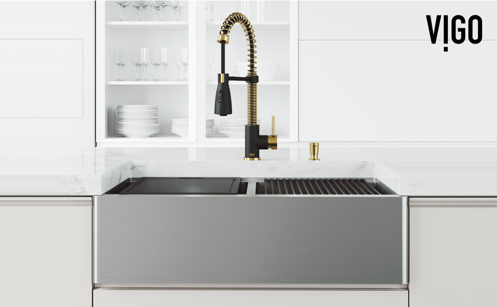 Classic design construction meets innovative technology with The Oxford Slotted Apron Front Stainless-Steel Farmhouse Kitchen Sink Set with Brant Faucet by VIGO. Taking inspiration from the industrial-chic design aesthetic, the faucet flaunts sleek coils and a pull-down hose. The construction of the sink adds a smooth texture to this exceptional kitchen sink set. Elegant in design and ergonomic in function, it seamlessly maximizes the form and functionality of your kitchen. The set is complete with a matching soap dispenser.