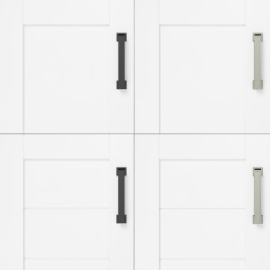 The Rigsby vanity ships with black and satin nickel hardware. Customize the look of your bathroom with doors that are reversible between shiplap and smooth shaker panels.