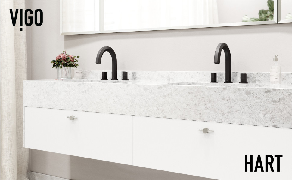 Introduce industrial design into your bathroom with The Hart Collection by VIGO. Defined by stunning silhouettes and contrasting textures, this widespread bathroom faucet features two sleek handles, intricate diamond knurling details, and a hexagonal-shaped silhouette. The two handles are designed for easy operation and seamless water volume and temperature control. The gooseneck faucet provides plenty of space for hand-washing and the solid brass construction ensures long-lasting durability. This two-handle bathroom faucet features a simple DIY installation process that makes transforming your bath space quick and easy.