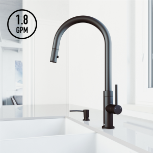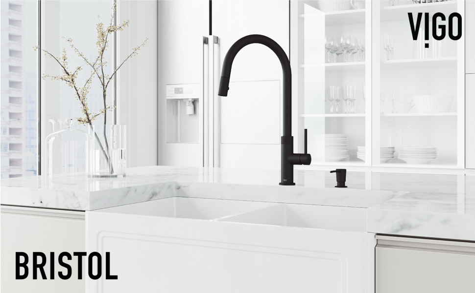VIGO Bristol pull-down kitchen faucet with soap dispenser is a stylish addition to your home. It features a sleek, modern design that gracefully fits any contemporary kitchen. The included soap dispenser has a pump above the counter and is easily refillable from the top. Its pull-down spray head provides extended reach and flexibility, enabling you to easily clean and fill your utensils. The faucet's ceramic disc valve and 1.8 GPM flow rate help ensure drip-free performance while maintaining consistent water pressure. The 360-degree swivel spout with a single handle allows you to turn and operate the faucet effortlessly. VIGO's installations are simple and require no special tools. The multi-layered hardware coating withstands wear and tear, keeping the Bristol as pristine as day one!