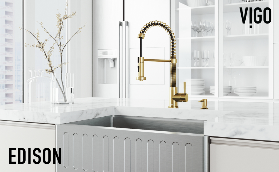 VIGO's signature Edison pull-down kitchen faucet with soap dispenser features a sleek, modern design that gracefully suits any contemporary kitchen. The included soap dispenser has a pump above the counter and is easily refillable from the top. Its pull-down spray head provides extended reach and flexibility, enabling you to easily clean and fill your utensils. The faucet's ceramic disc valve and 1.8 GPM flow rate help ensure drip-free performance while maintaining consistent water pressure. The 360-degree swivel spout with a single handle allows you to turn and operate the faucet effortlessly. The dual-action sprayer delivers an aerated flow of water or a powerful spray with the click of a button. VIGO's installations are simple and require no special tools. The multi-layered hardware coating withstands wear and tear, keeping the Edison as pristine as day one!