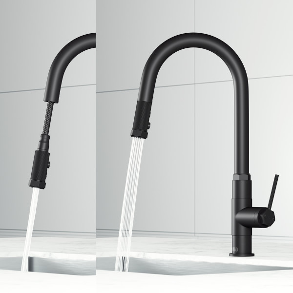 Elevate your kitchen with the VIGO Hart Arched Single Handle Pull-Down Sprayer Kitchen Faucet, a perfect blend of modern design and superior functionality. Its sleek design makes a bold statement, complementing contemporary, minimalist, and industrial kitchen spaces. The high-arc spout provides ample clearance for filling large pots or cleaning oversized cookware, while the retractable pull-down sprayer effortlessly switches between a powerful stream and a fine spray for versatile kitchen tasks. The ergonomic single-handle operation ensures smooth, precise control over water flow and temperature. Available in four modern finishes—stainless steel, chrome, matte black, and matte brushed gold—this faucet is built to last, with durable construction ensuring long-lasting performance. The unique hexagonal detailing at the base adds an architectural edge, transforming your sink into a striking focal point that combines beauty and efficiency.