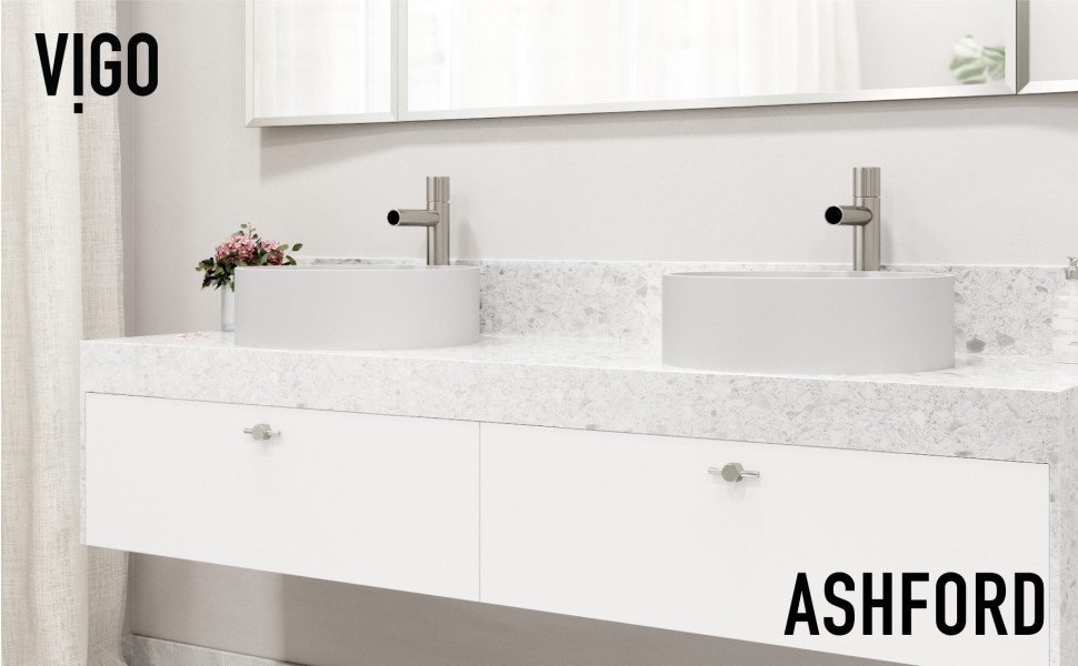 Drawing inspiration from New York City’s architecture, The Ashford Collection by VIGO delivers a flawless vessel bathroom faucet for vessel sinks. Turn on the single handle knob and water effortlessly cascades through the high barrel spout for a calming hand-washing experience. With clean lines and a cylindrical design, the brushed nickel bathroom faucet features a solid brass construction that ensures lasting durability. The Ashford Collection pares down to modern sensibility and functional form, making it ideal for any bathroom sink or vanity.