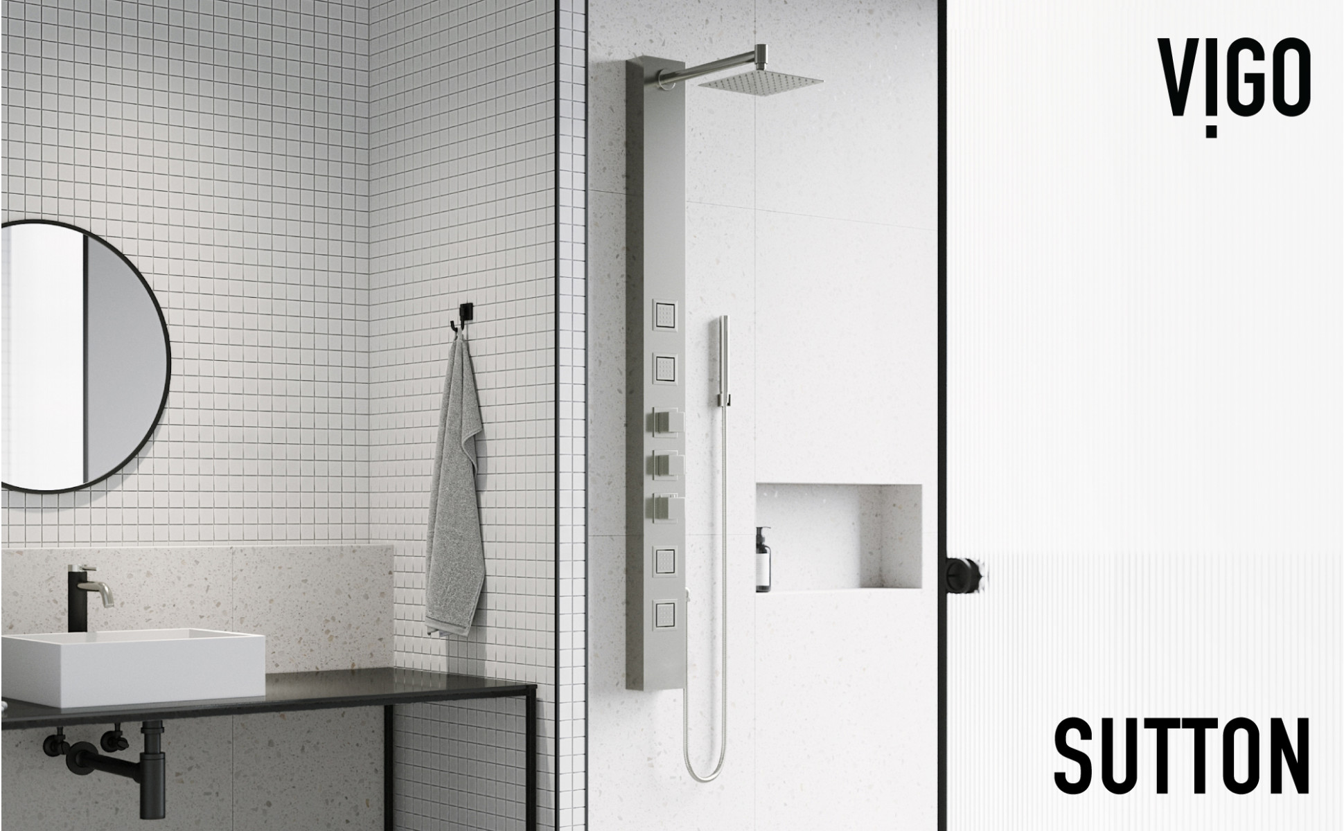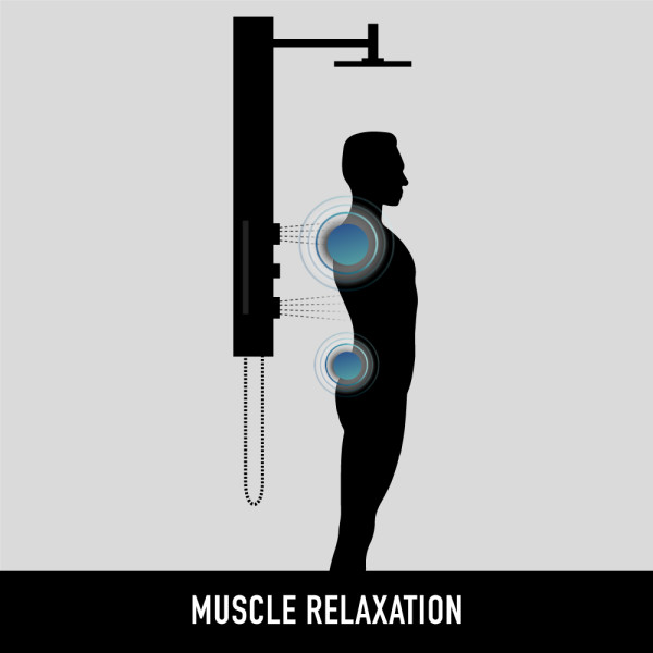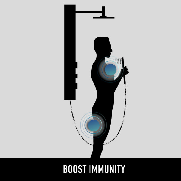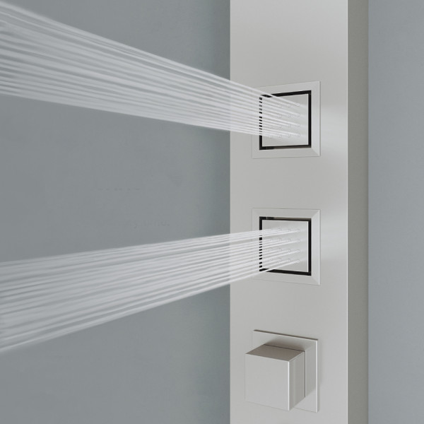 The top knob enables effortless switching between shower functions, the soothing rainfall showerhead, invigorating body jets, or versatile handheld unit.