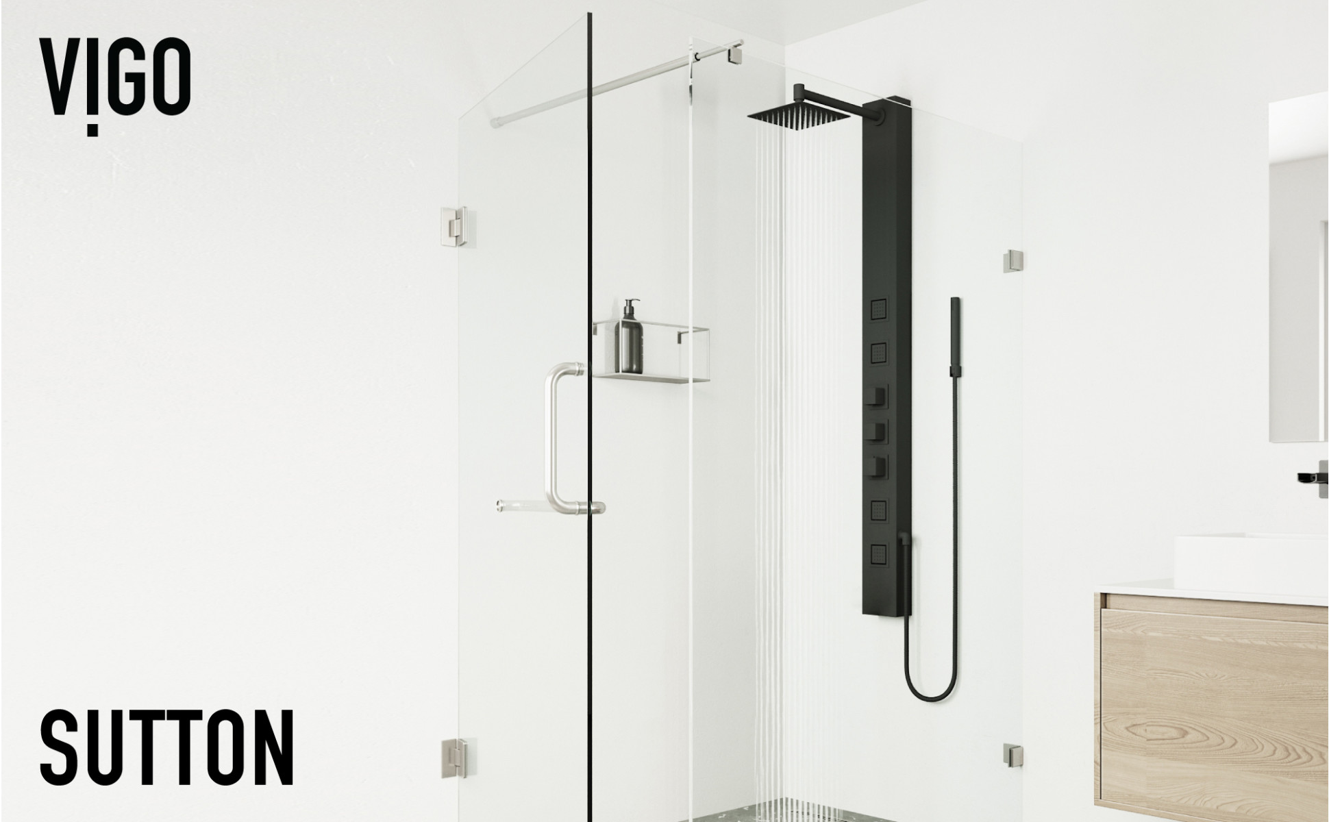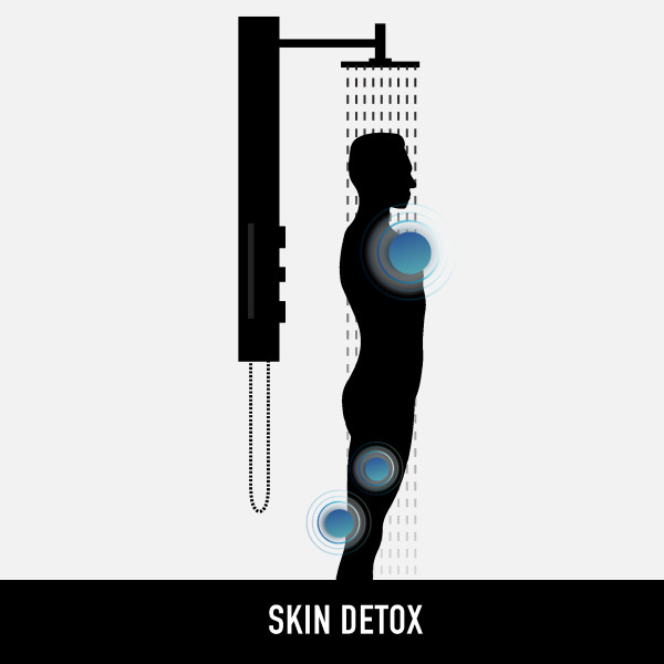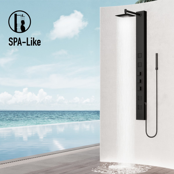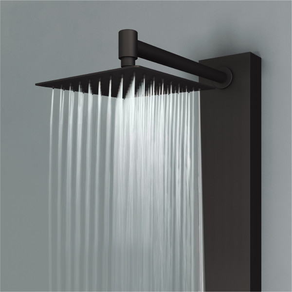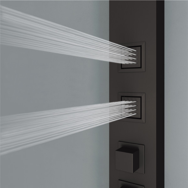 The top knob enables effortless switching between shower functions, the soothing rainfall showerhead, invigorating body jets, or versatile handheld unit.