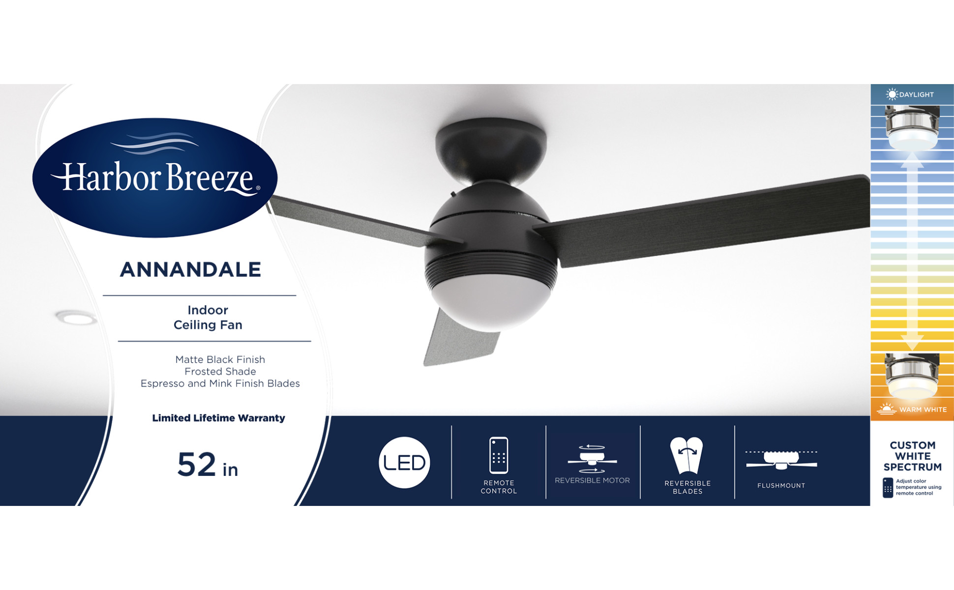 Matte black ceiling fan from the Annandale collection features 3 reversible blades in espresso and mink finishes