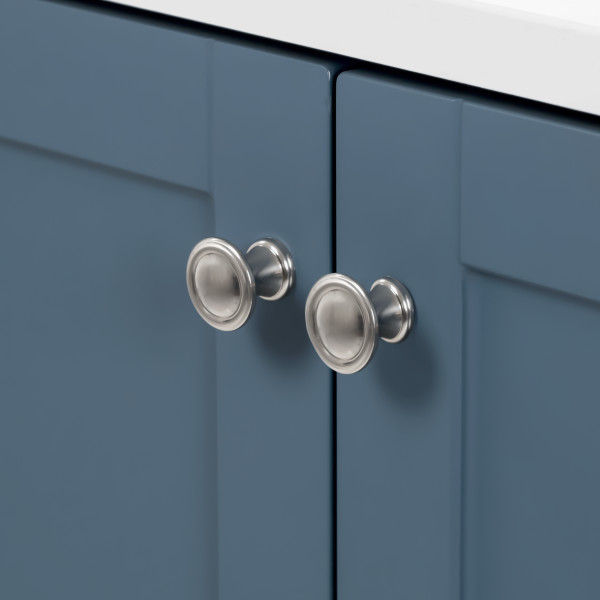 Inset recessed panel doors are accented by satin nickel drawer and door pulls