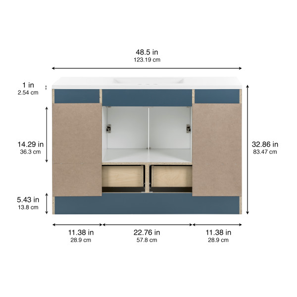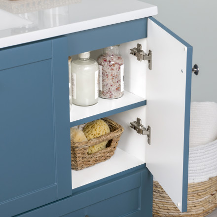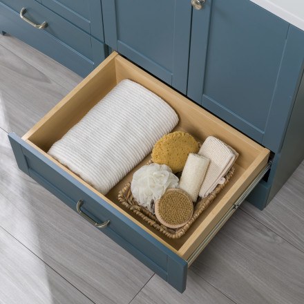 Drawers are mounted on full-extension drawer glides for full and easy access to all your bathroom essentials.