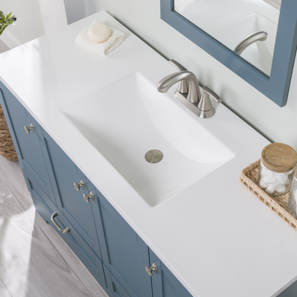 This bathroom vanity combo includes a 1-piece cultured marble vanity top that's predrilled for a 4-in centerset faucet and includes an integrated rectangular sink.