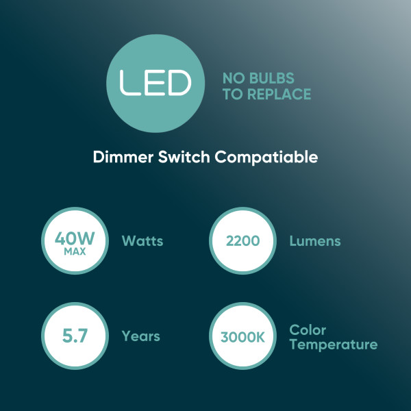 Integrated LED is dimmable, 2200 lumens, 40W, 3000K warm white color temperature
