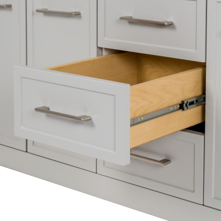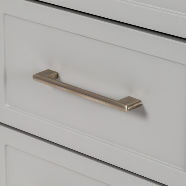 Full-overlay skinny Shaker-style drawers and doors are accented by satin nickel hardware.