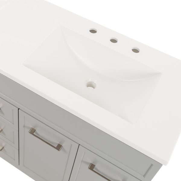 This double bathroom vanity combo includes a 1-piece cultured marble vanity top that's predrilled for two 8-in widespread faucets and includes 2 integrated rectangular sinks.