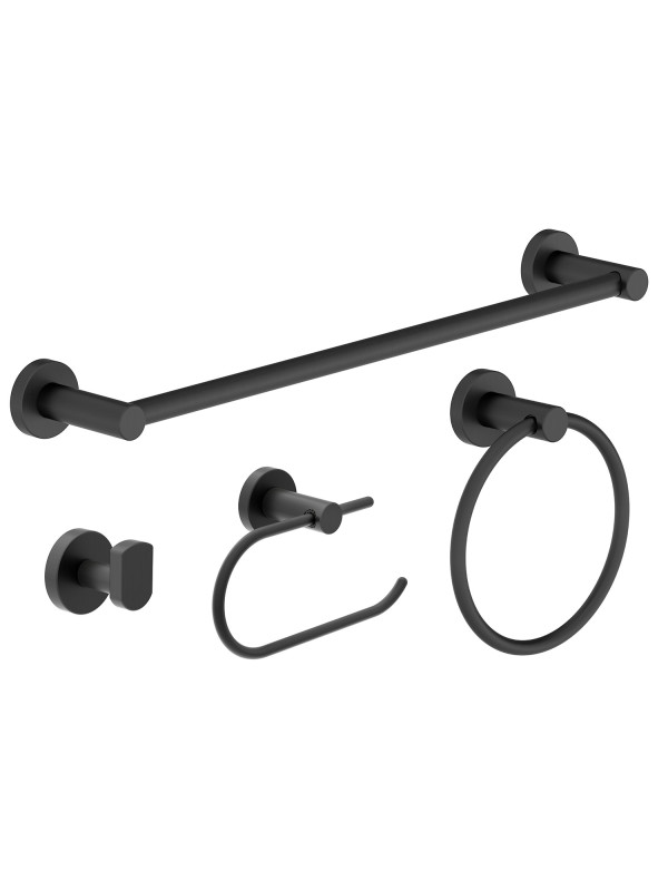 Includes toilet paper holder, towel ring, robe hook, and 18 inch towel bar