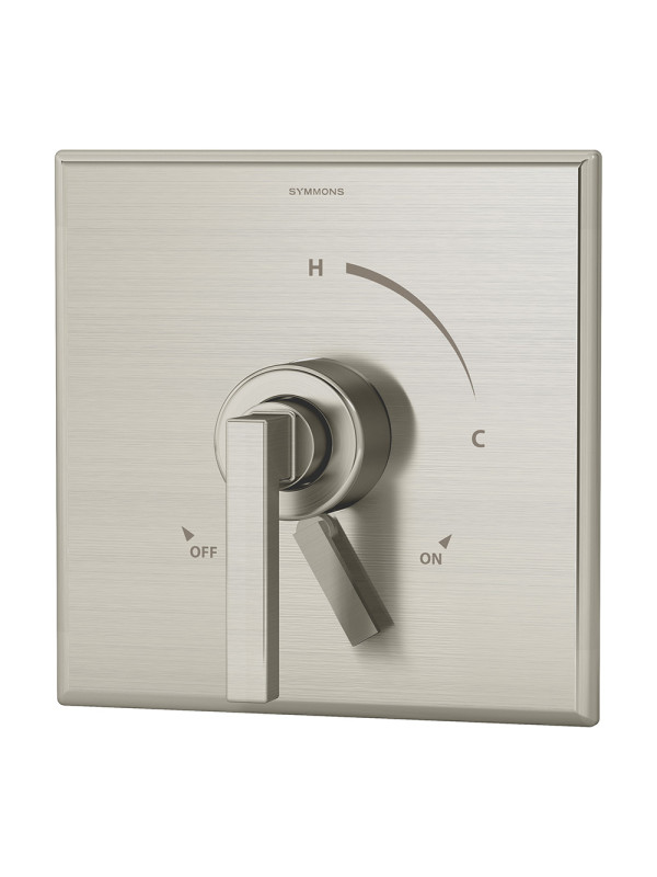 The ultra contemporary styling of this Duro Single Handle Wall Mounted Shower Trim Kit was inspired by the clean geometric shape of modern architecture. This shower trim kit is covered in a scratch resistant finish over solid metal and includes a brass escutcheon, shower lever handle, and integral volume control handle to adjust the shower water volume. The solid brass valve cover plate features hot and cold indicators to ensure custom water temperature setting and ease of use for everyone. This model includes everything you need for quick installation, allowing you to easily update your bathroom without replacing your valve. With durable features that are crafted to last and a unique, minimalistic style, the Symmons Duro Single Handle Wall Mounted Shower Trim is a seamless and valuable addition to any modern bathroom and is backed by our limited lifetime warranty.