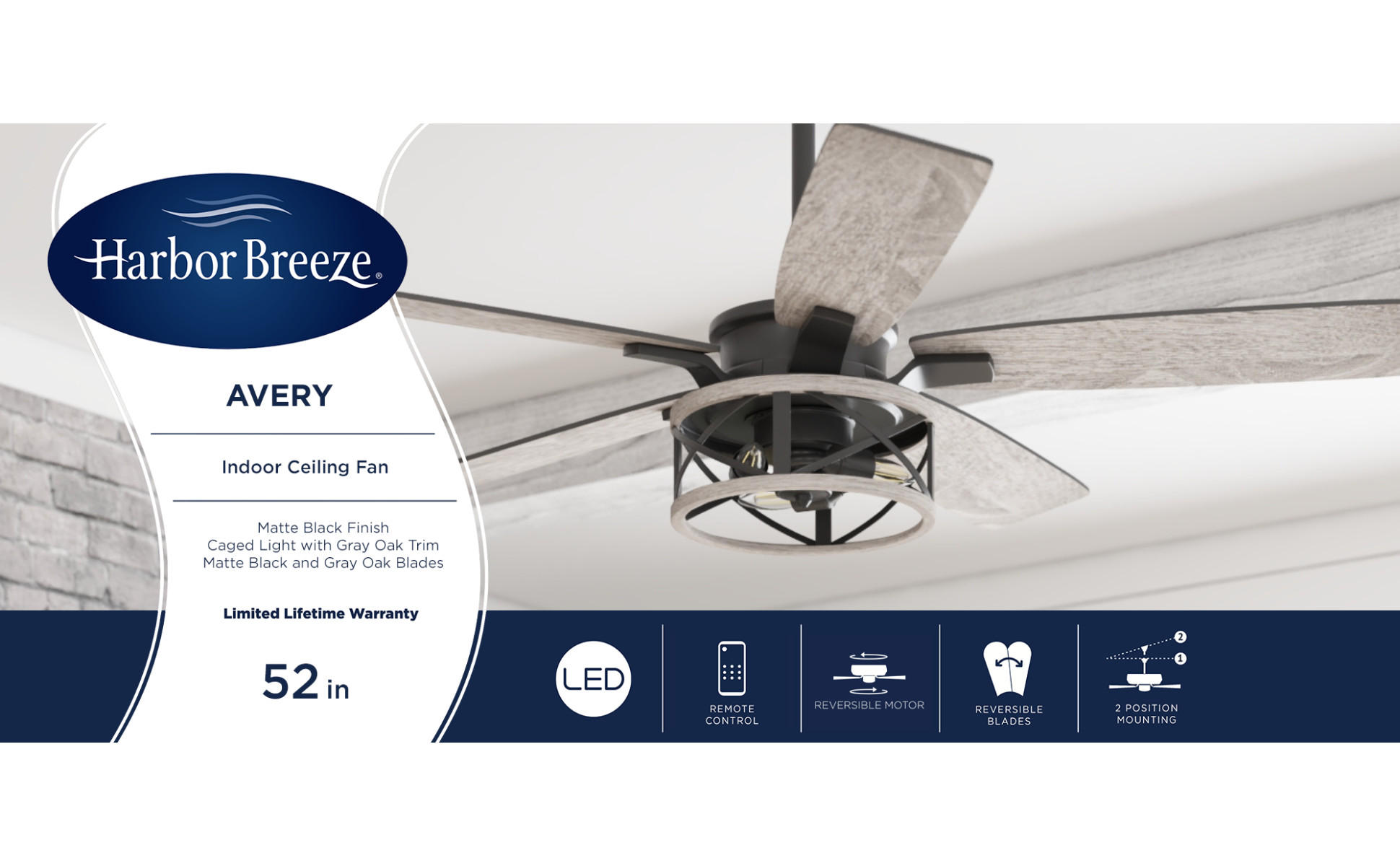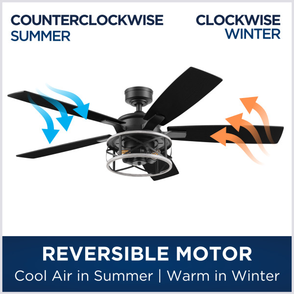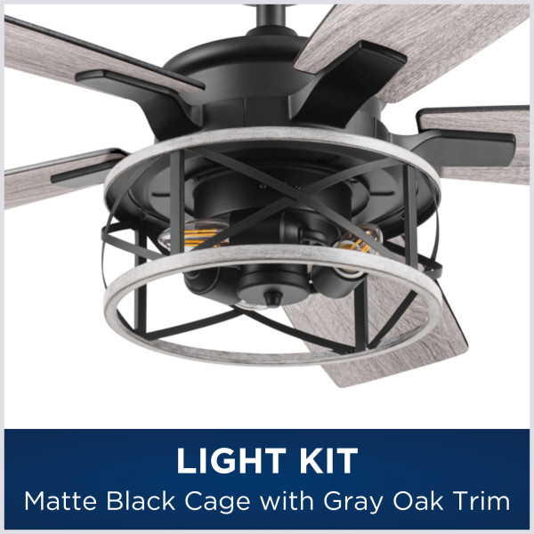 Matte black finish ceiling fan features 5 reversible aged matte black / gray oak blades so you can choose the right look for your home