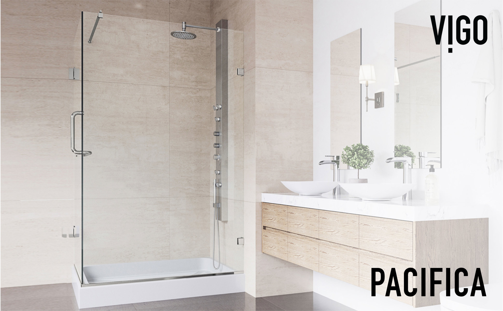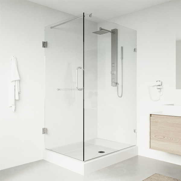 With its hinged door providing easy, wide access, the VIGO Pacifica Frameless Shower Enclosure is a modern, functional addition to any bathroom. Constructed from stainless steel, solid brass, and high-quality 3/8 in. tempered glass, this shower enclosure is as durable as it is beautiful. The door features a sleek curving handle as well as a convenient towel bar. With a single water deflector along the bottom seal strip, water is redirected back into the shower to keep your bathroom dry, clean, and pristine. This model comes complete with a right-draining, easy-to-clean, white shower base.