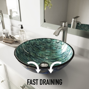 Handcrafted from premium tempered glass, the VIGO Oceania Glass Vessel Bathroom Sink is ideal for everyday use. The polished interior and textured exterior are stain-resistant and easy to clean. With beautiful aqua hues and gold flecks on the interior, this sink features a softer brushed blue and white pattern on the exterior to make it simultaneously neutral and versatile.