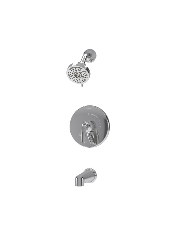 This trim kit consists of a showerhead, shower arm, escutcheon, tub spout, shower lever handle, and volume control handle.