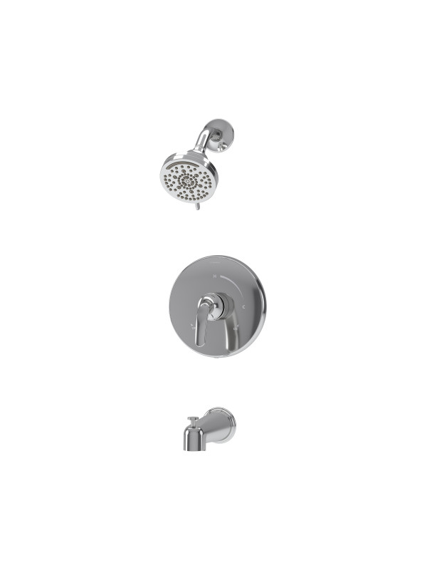 This trim kit consists of a showerhead, shower arm, escutcheon, tub spout, shower lever handle, and volume control handle.