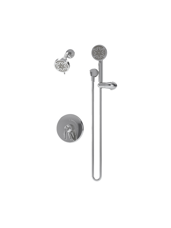 This Elm shower trim kit includes a showerhead, shower arm, escutcheon, hand spray with 60 inch flexible hose, a slide bar for the hand spray, shower lever handle, and volume control handle.
