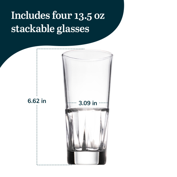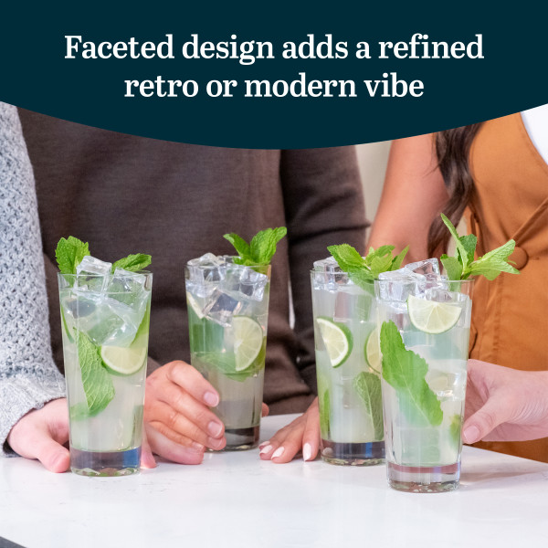 Libbey Bellevue Cute Cocktail Glasses: Elevate your drink presentation with this ice latte glasses set, designed to bring flair and confidence to every pour, whether you are entertaining guests or enjoying a quiet evening at home. These stackable drinking glasses are designed to hold an optimal 13.5-ounce of beverage and are crafted from restaurant-style fine quality glass. This dinner glasses set of 4 features a striking faceted design that reflects light beautifully, giving each drink a modern shimmer or a hint of retro charm depending on how it is served. The clear glass drinking glasses are built for both style and practicality, with a safedge rim and inner ridge that ensures balanced, consistent stackability. A thick, sturdy base provides a comfortable grip and lasting durability, making these glasses ideal for everyday use or special occasions. Offering effortless cleanup, this summer glassware maintains its charm through everyday use. Perfect for cocktails, mojitos, iced tea, water, and more, these retro glassware are an essential addition to any home bar.