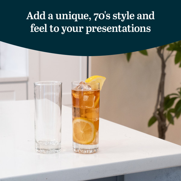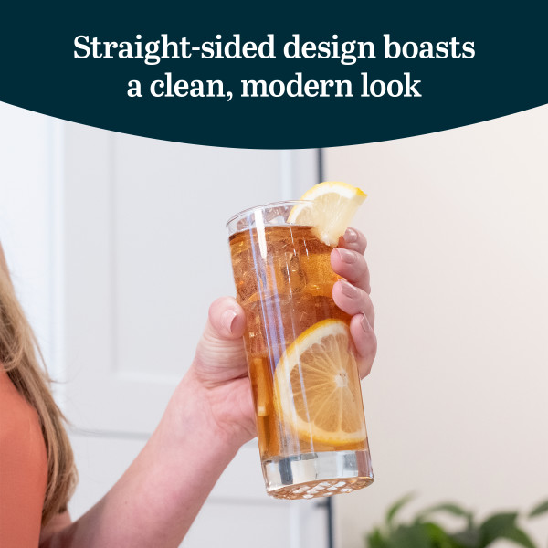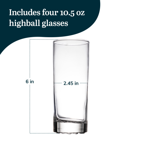 Libbey Aspen Highball Glass Set: Elevate your drink presentation with this highball glasses set of 4, designed to bring flair and confidence to every pour, whether you are entertaining guests or enjoying a quiet evening at home. This glassware set of 4 is designed to hold an optimal 10.5-ounce of beverage and is crafted from restaurant-style fine quality glass, featuring a sleek, modern silhouette with clean lines and a retro bubble-like base that ensures secure traction on tabletops, counters, and trays and keeps the dinner glasses from sticking to wet surfaces. Built with a thick sham for added stability and balance, this clear tall glasses drinking set is finished with chip-resistant Safedge rims to ensure dependable use over time. Dishwasher safe for effortless cleanup, this ice tea glasses set of 4 maintains its charm through everyday use. Perfect for cocktails, mojitos, iced tea, water, and more, these barware glasses are an essential addition to any home bar.